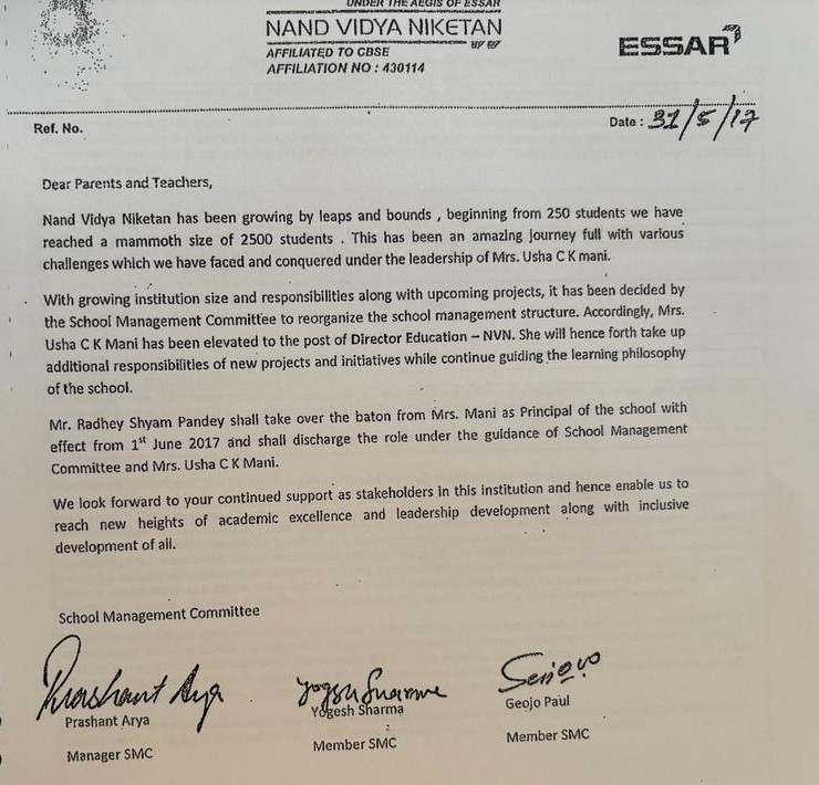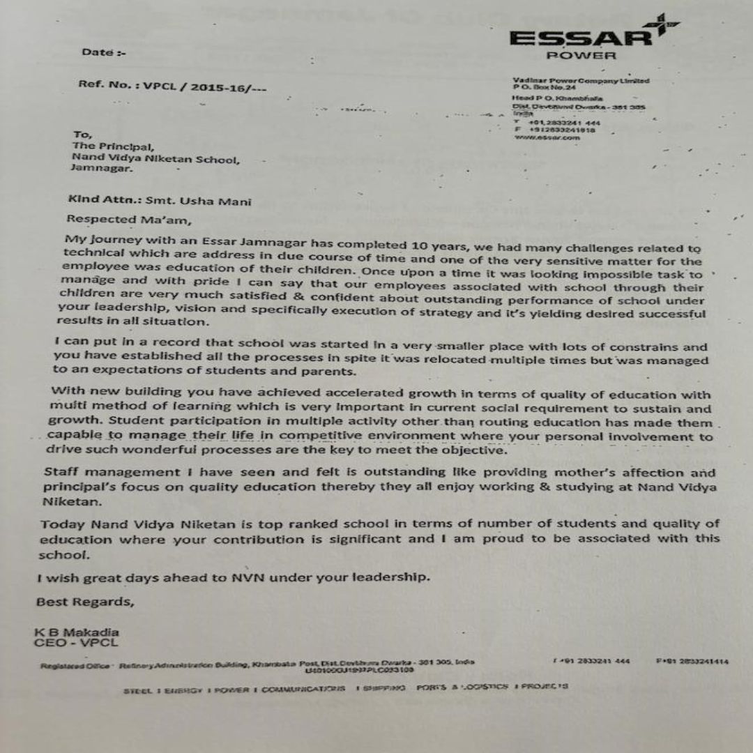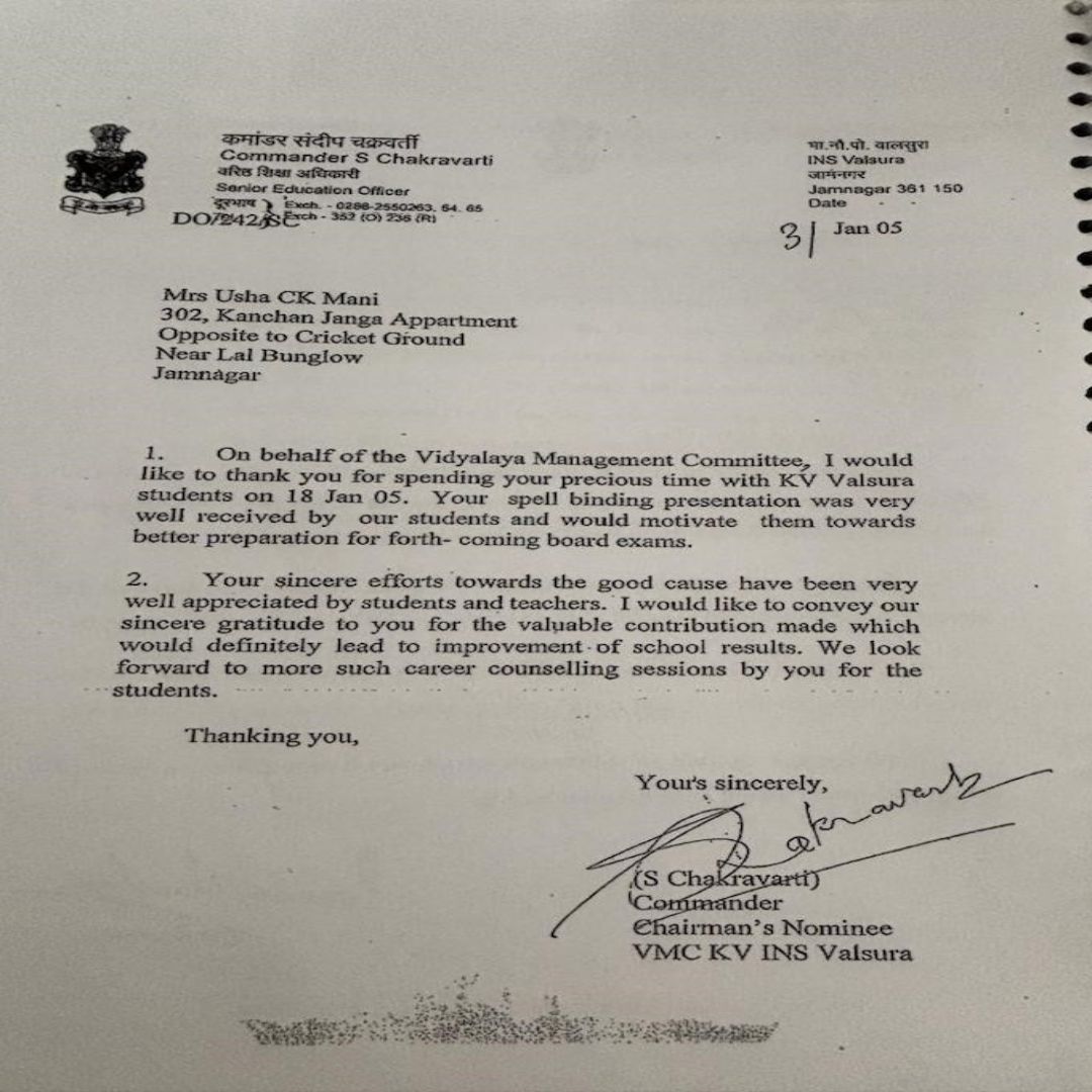 Appreciation letter from Commander S. Chakravarti, Senior Education Officer, Jamnagar