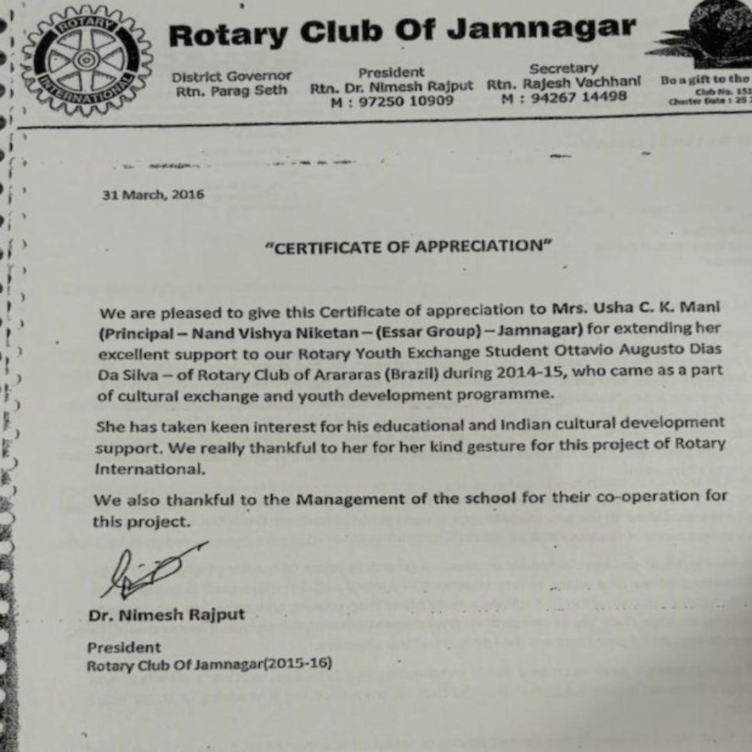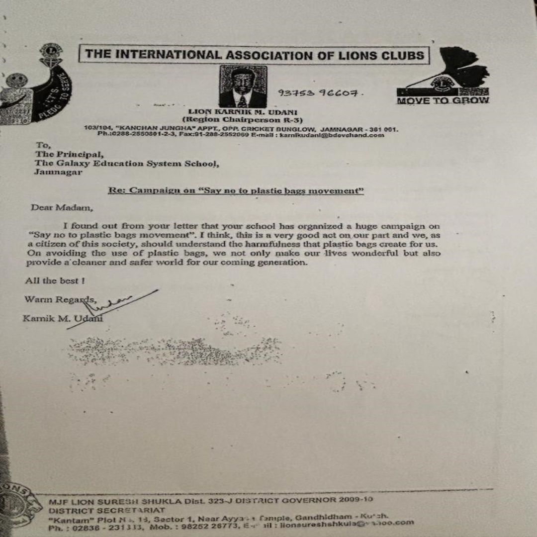 Appreciation Letter from International Association of Lions Club, Jamnagar