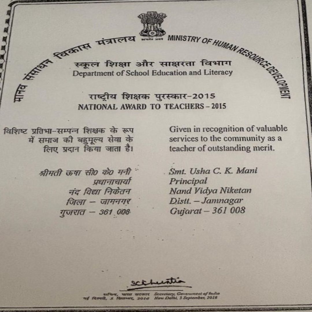 National award to teachers Highest Honors conferred By the President Of India Shri . Pranabh Mukherjee in the year 2015 for my contributions in the field of education on inclusive education.