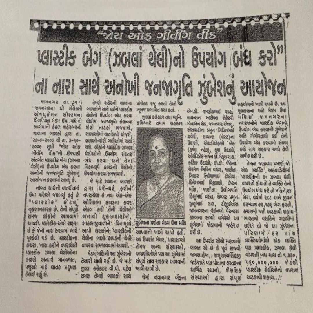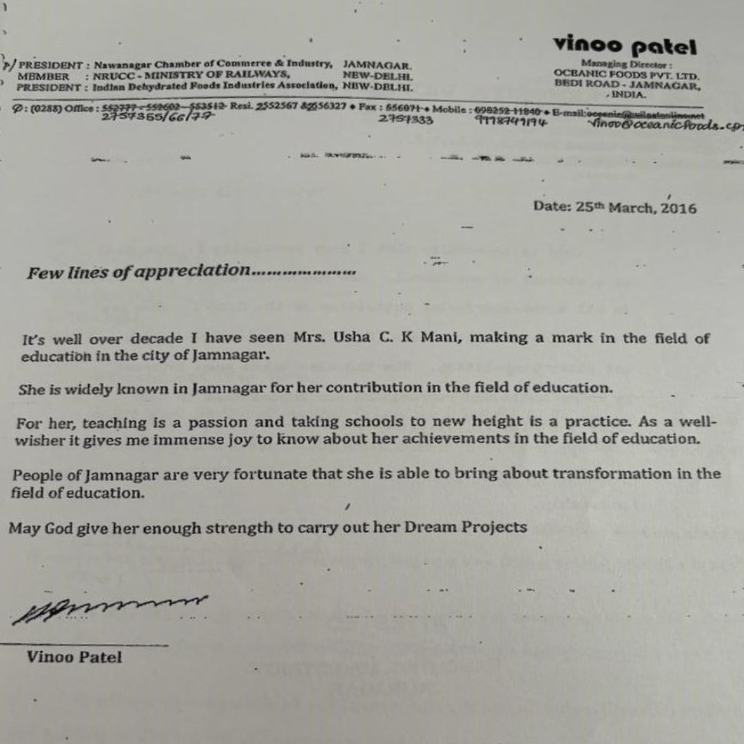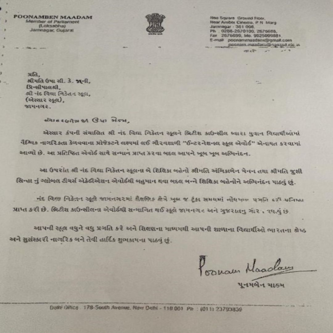 Appreciation Letter from Member of Parliament of Jamnagar- Smt. Poonam Ben Madam
